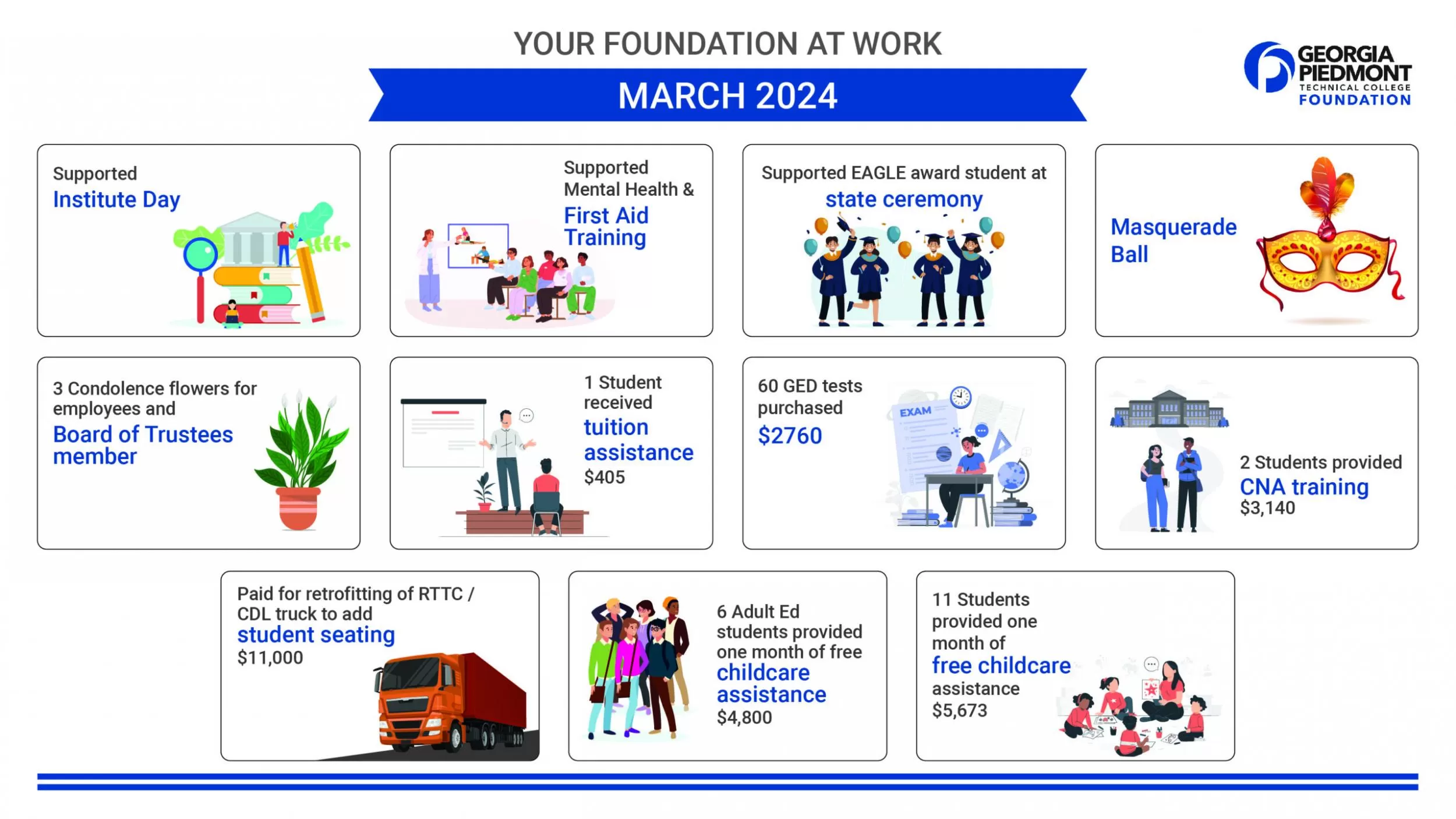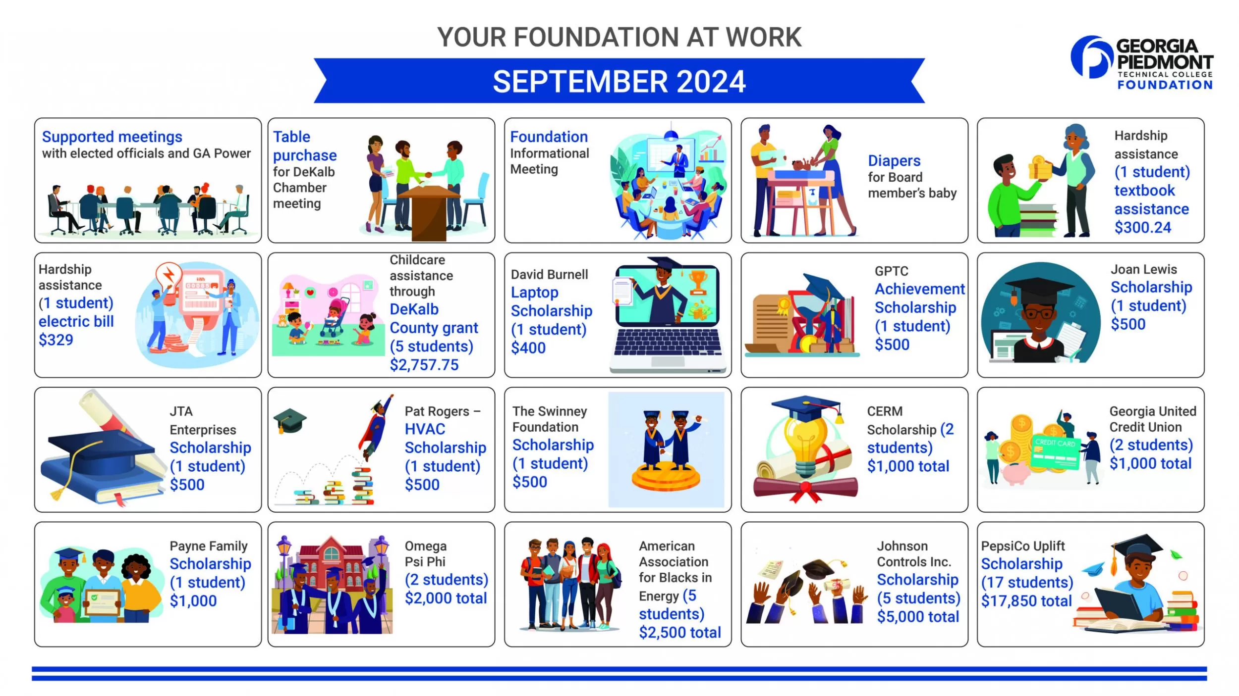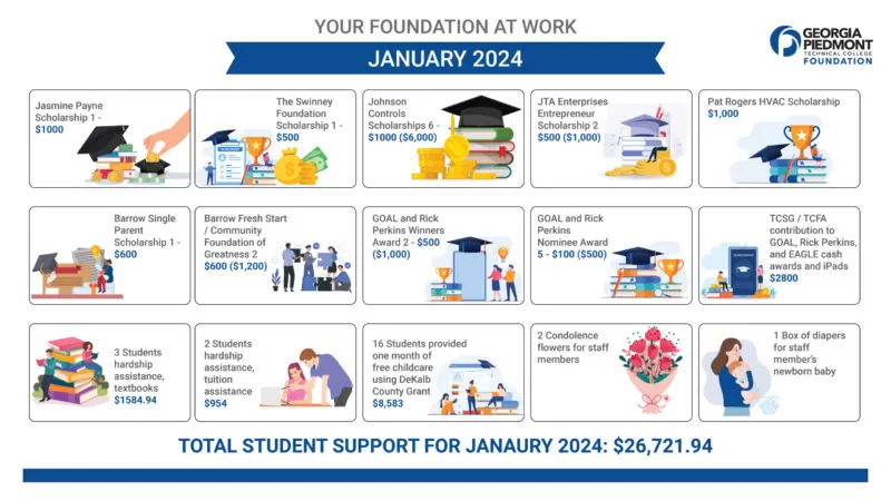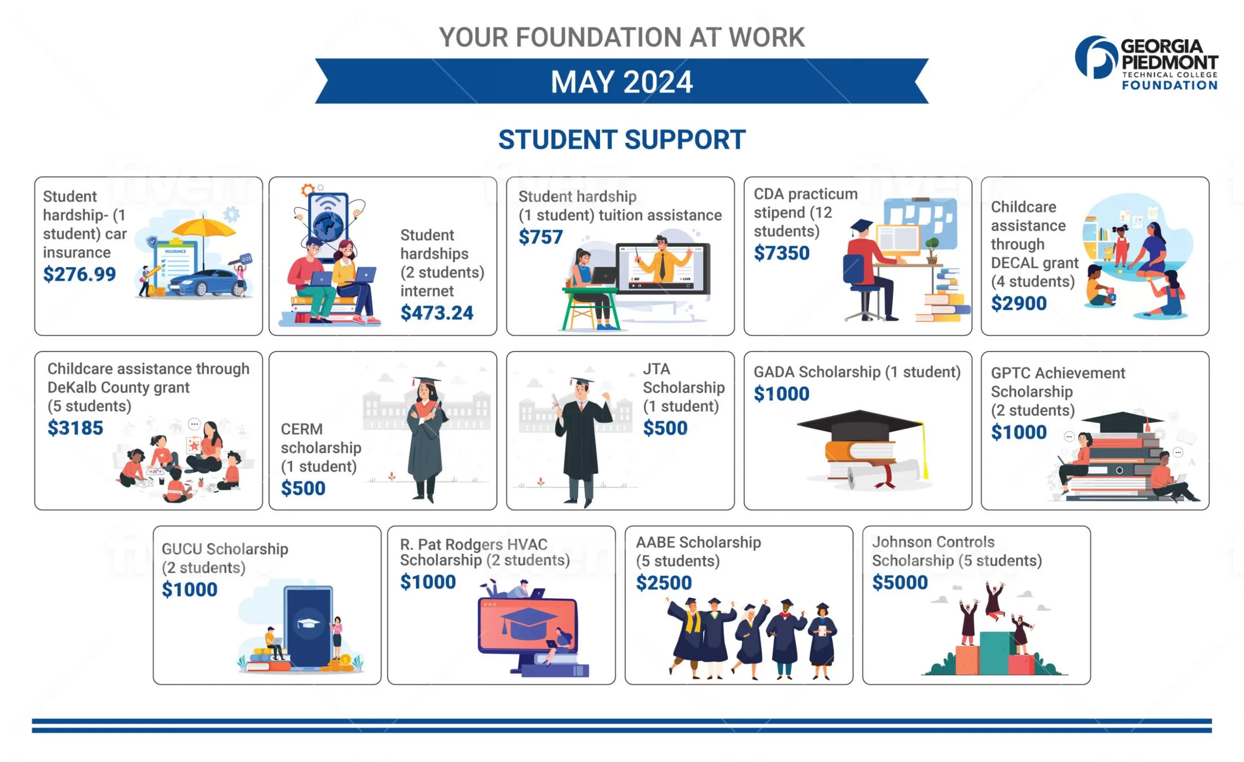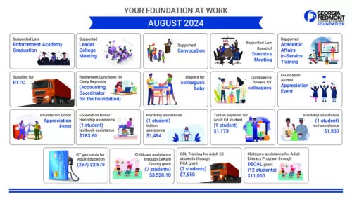 The Georgia Piedmont Technical College Foundation is grateful for the support of alumni, faculty, staff, students, and friends. These generous contributions are why the College can assist deserving students, recruit and retain top faculty, and bring the latest technology to labs and classrooms.