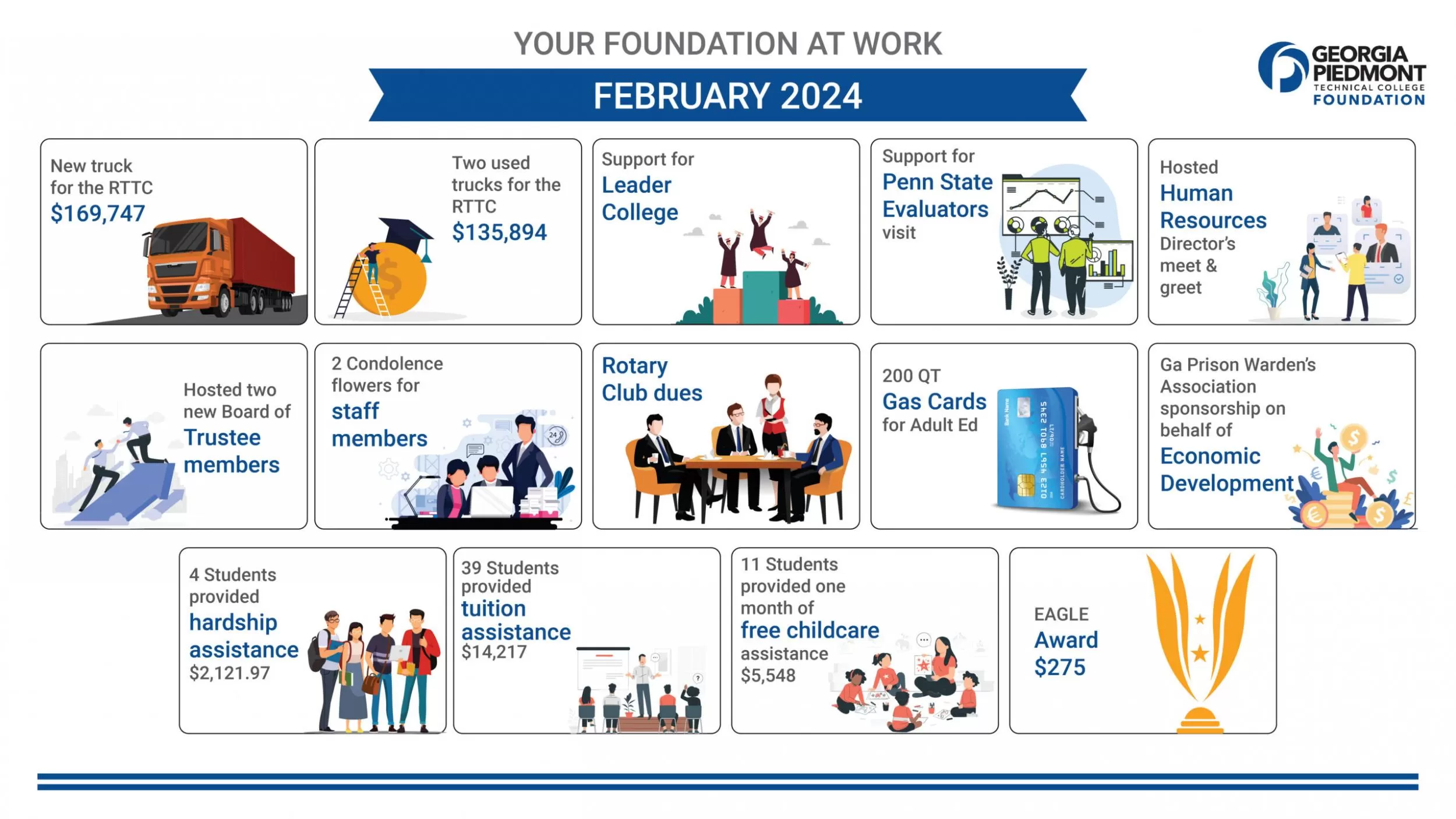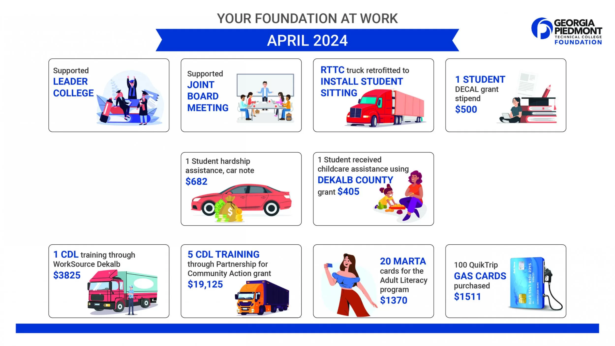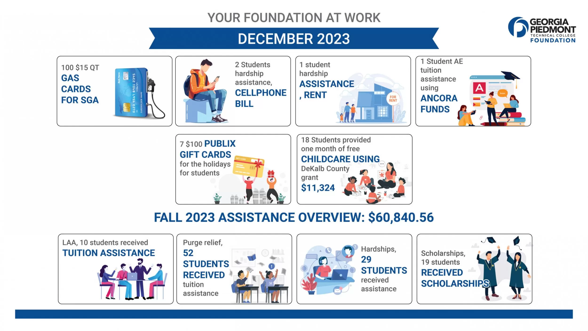 The Georgia Piedmont Technical College Foundation is grateful for the support of alumni, faculty, staff, students, and friends. These generous contributions are why the College can assist deserving students, recruit and retain top faculty, and bring the latest technology to labs and classrooms.